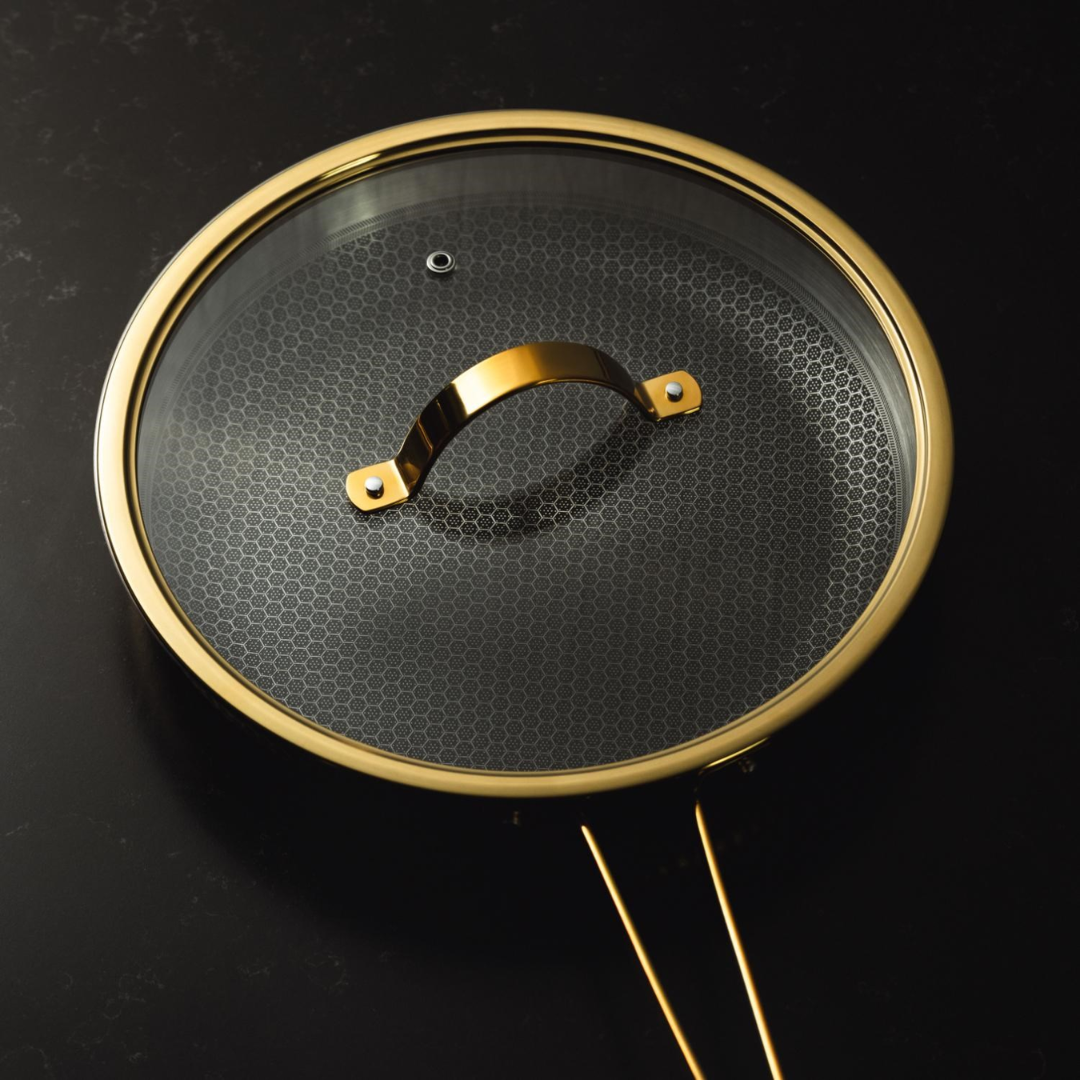 Modell Lb, eine 28 cm große Bratpfanne mit Deckel (Messing, BRASSA-Serie).