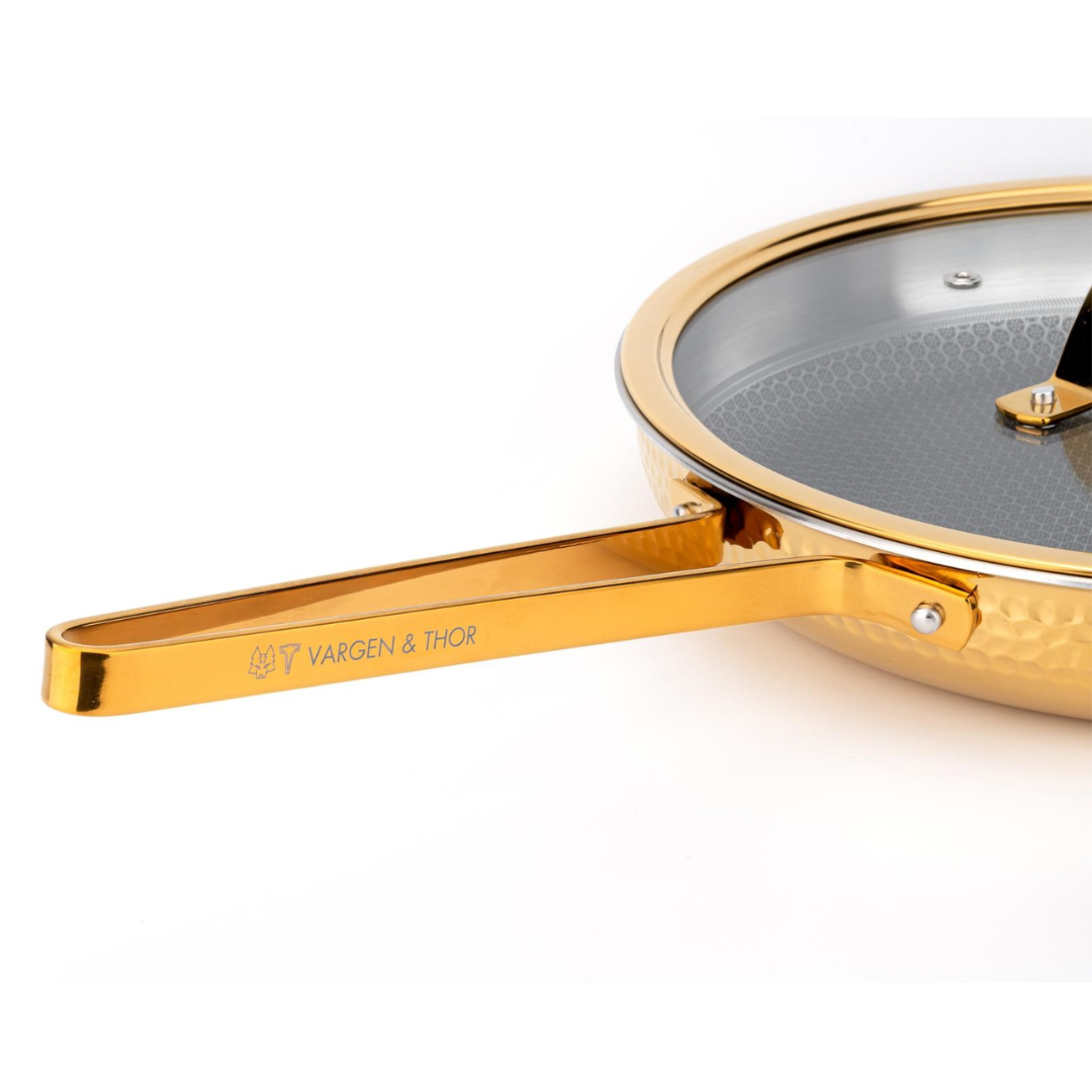 Modell Lb ist eine elegante Pfanne von Vargen & Thor mit einer Höhe von 28 cm und einer gehämmerten Oberfläche aus reinem Stahl. Passt zu anderen Modellen der BRASSA- Serie von Vargen & Thor: ELIS & MEYA.