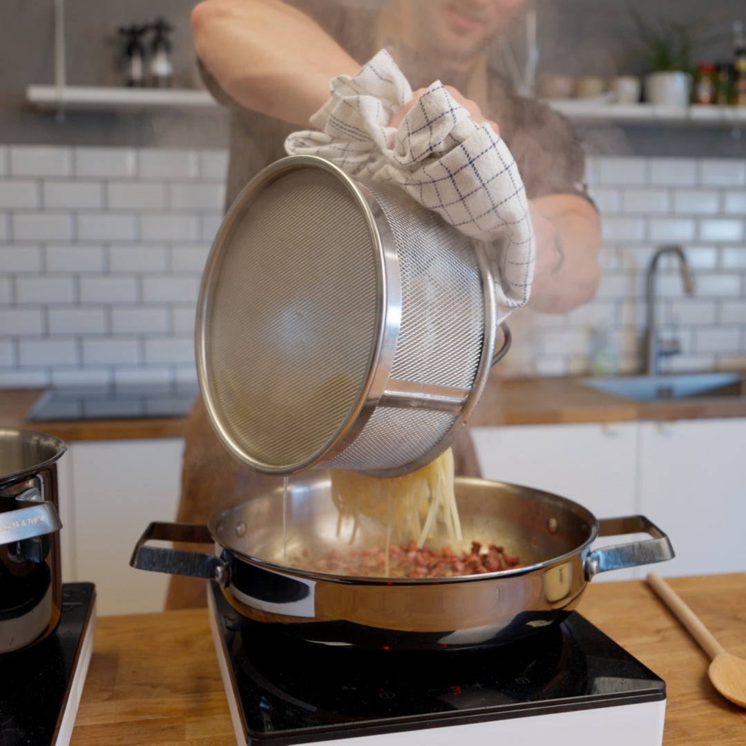 Robuste mattschwarze Nudelpfanne in Restaurantqualität mit schwarzen Details. Deckel im Lieferumfang enthalten. Pasta-Traum – eignet sich auch gut für den Wok.