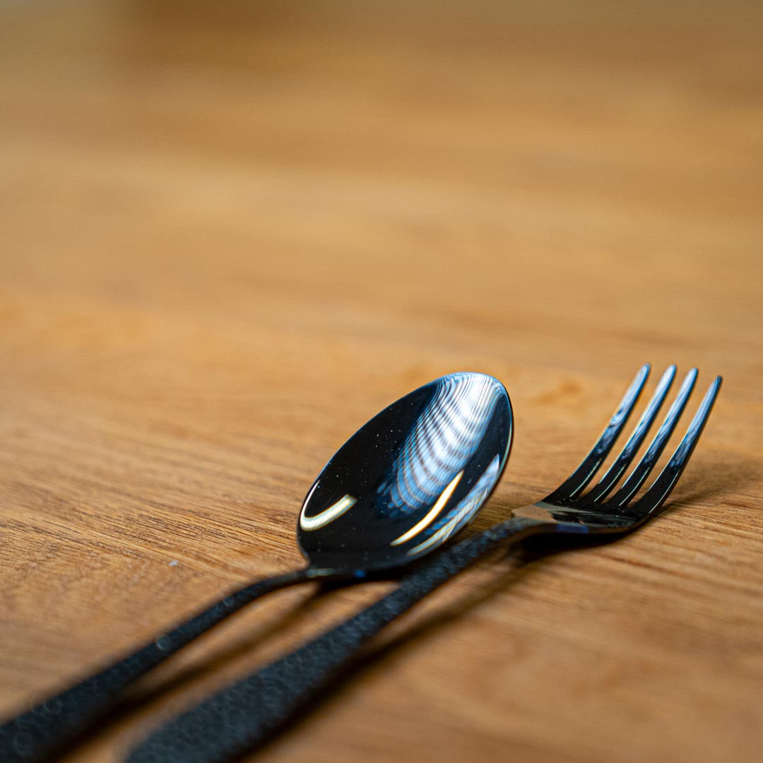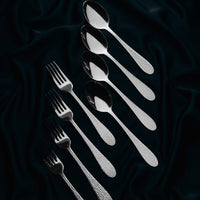 Eine perfekte Ergänzung zur ONYX- Serie (schwarz). Dessert-/Vorspeisenbesteck aus gehämmertem Edelstahl. Robust und 100 % spülmaschinenfest.