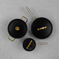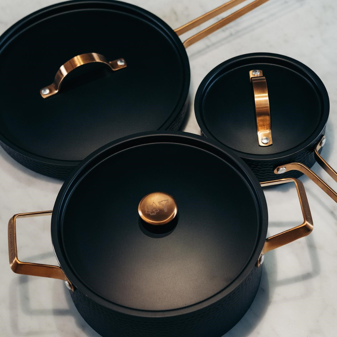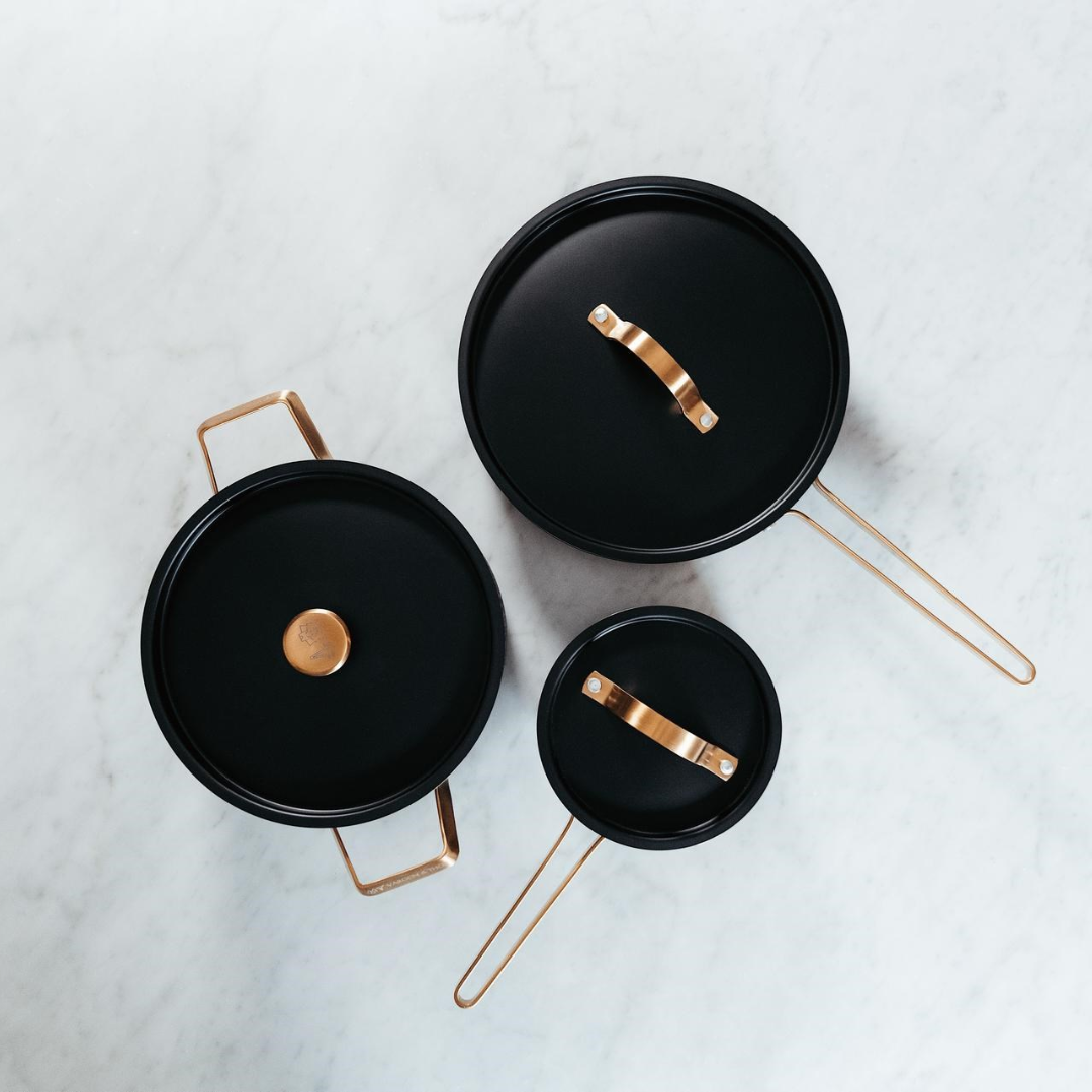 ARVET.1 - Sæt, 3 - Gryde, Kasserolle og sauterpander (Mat sort med messingdetaljer)