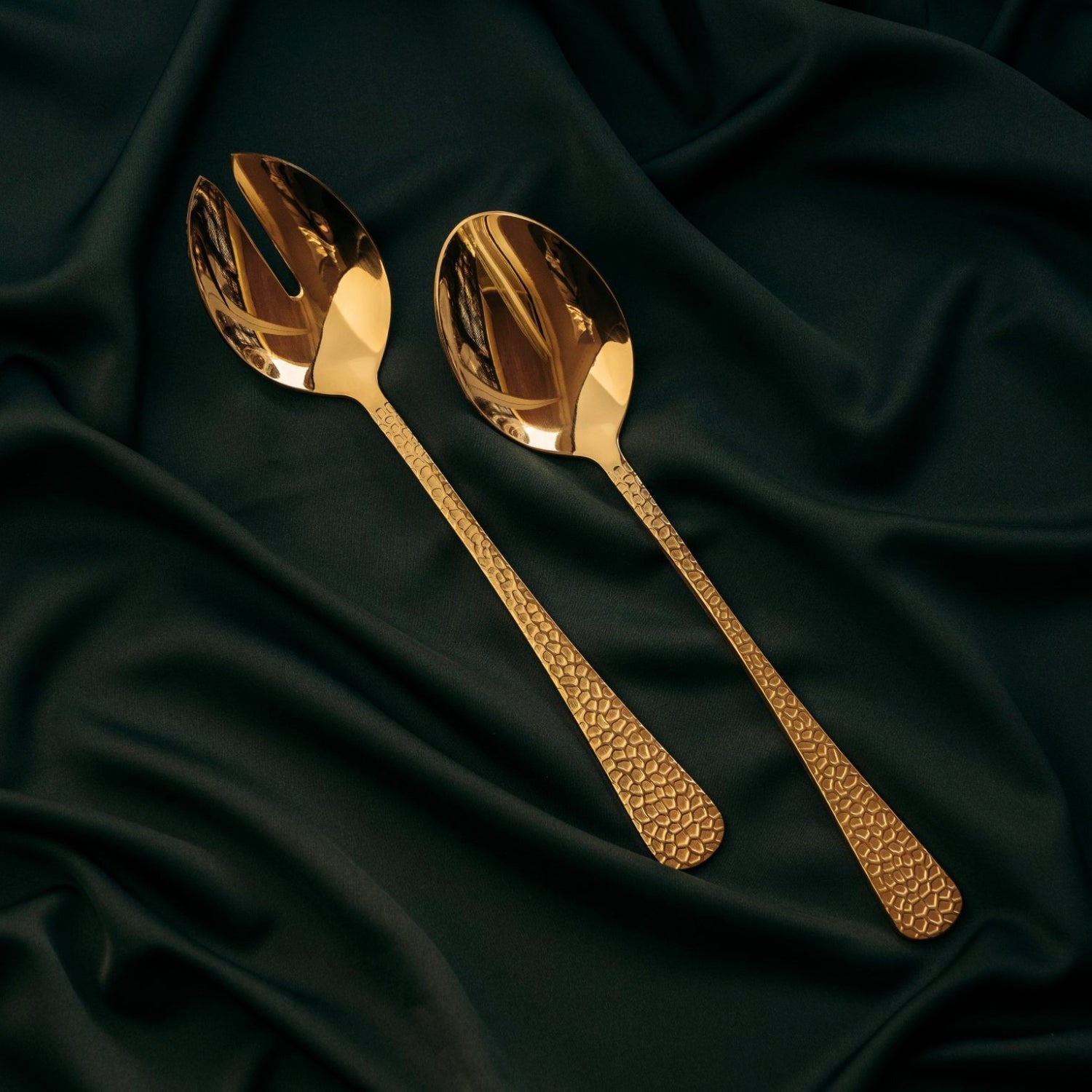 Et perfekt supplement og en ny tilføjelse til NIMBUS-serien. Salatbestik i hamret rustfrit stål. En flot messingfinish. Robust og tåler opvaskemaskine. Leveres i sæt med 2 stk.