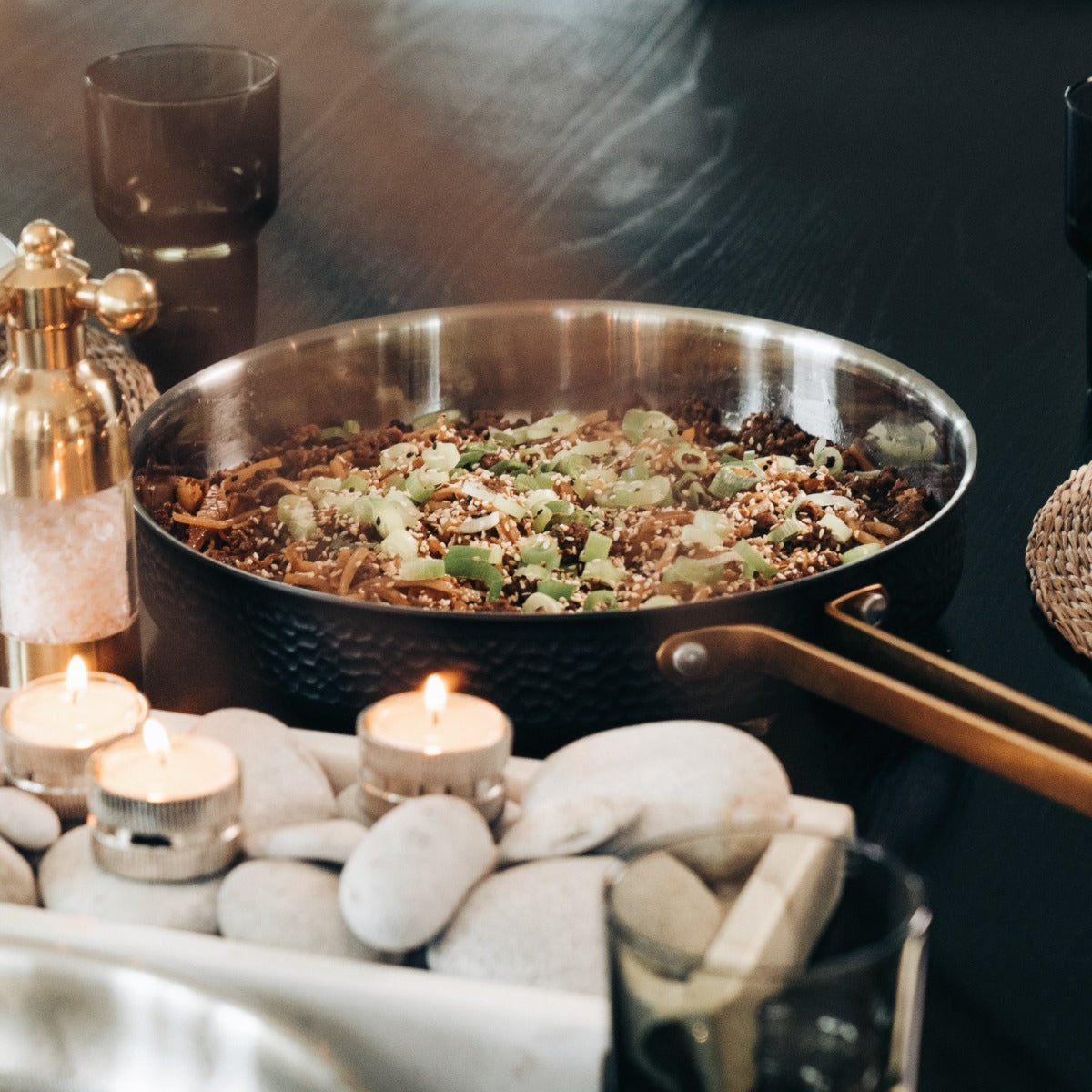 Modell X/X2 - 28cm Sauterpande med låg. Matsort med messingdetaljer.